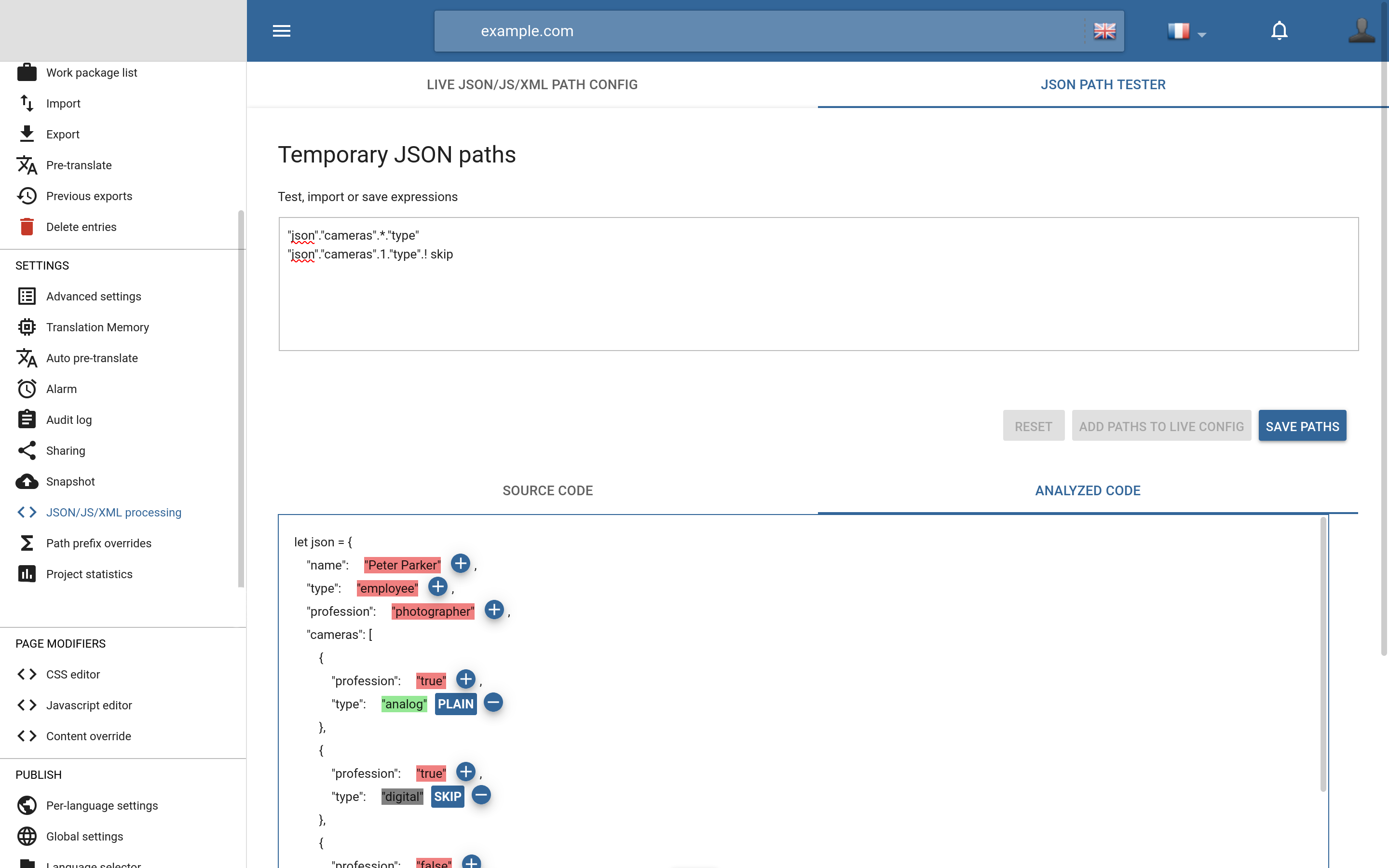 Individually marking every single string in JavaScript is tedious so we’ve had * and ** as wildcards for one or more levels respectively. Sometimes, however, these wildcard selections select strings that you don’t need. You can now use the new processing mode, skip, to skip them. You can also use it if you want to disable a rule, but not yet delete it.