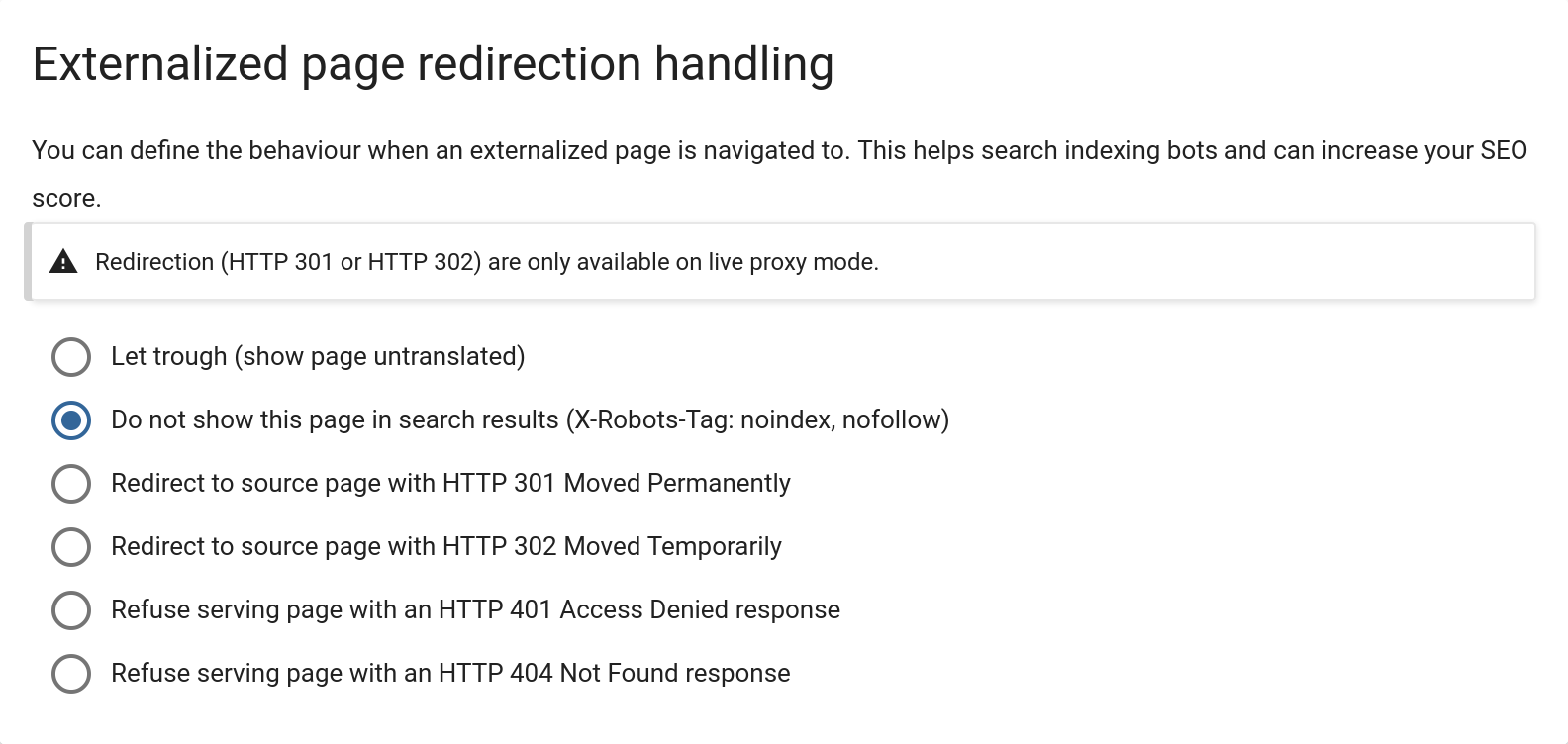 There isn’t much reason why robots should visit pages that you don’t translate but if they are linked to, they will. This can cause SEO penalties because of duplicate content. As a countermeasure, you can now choose to let robots know that these pages should be avoided. You can access this feature on Publish → Global settings → Externalized page redirection handling.