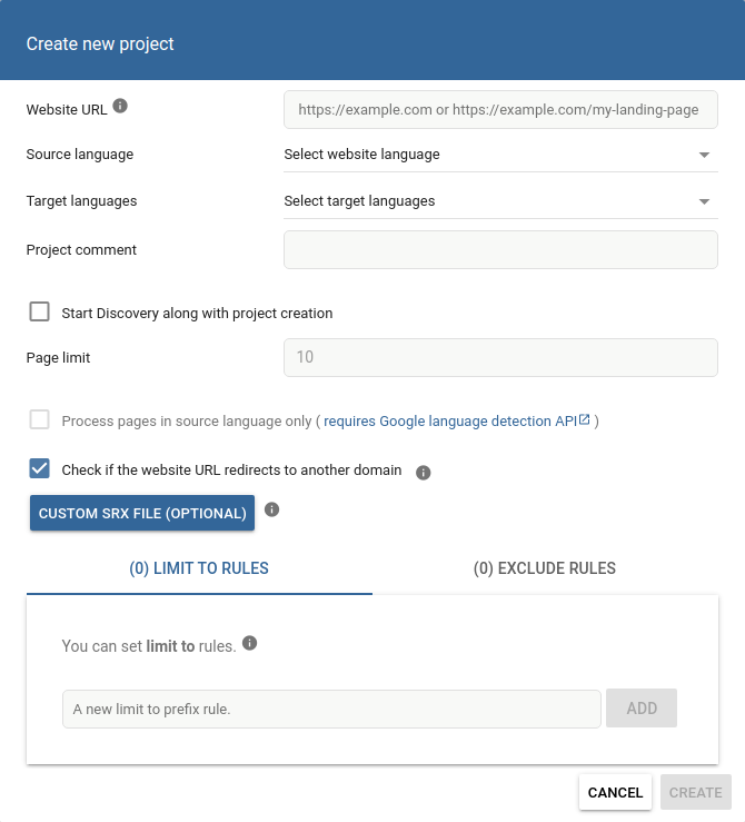 We found that the first thing we tend to do when creating a new project, alongside starting a Discovery, is adding a target language so that we can access the Preview and the x-proxy. I think it’s fair to assume that our support team isn’t alone in this. So, to facilitate this process, we added an option to specify the target language(s) directly in the project creation dialog.