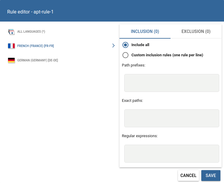 Auto pre-translate is a feature commonly used on projects where bleedthrough should be avoided but Snapshots can’t be used. It supports extensive customisation options. As you may already know, it supports two filtering rules. The first rule specifies whether the new content should be Machine translated while the second one whether it should be included in the XLIFF export generated for post-editing. These rules used to support path prefixes. This month, we updated the editor to look like this: