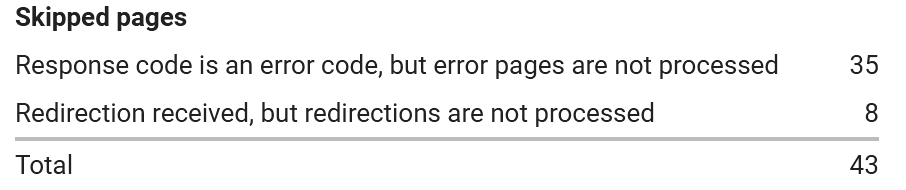 Nous avons ajouté une nouvelle section à la carte récapitulative des demandes dans la liste des analyses. Il affiche des statistiques pour les pages qui n'ont pas pu être traitées pendant l'analyse. Ne les traitez pas comme des avertissements. Selon vos paramètres, les pages non traitées peuvent être parfaitement normales. Prenez la capture d'écran ci-dessous, par exemple. Je l'ai pris après avoir réexploré notre propre site, easyling.com. J'ai défini l'analyse pour vérifier la liste des pages en cours. Il y a 35 pages où le code de réponse est un code d'erreur, mais les pages d'erreur ne sont pas traitées. Ce sont des pages qui étaient sur le site mais qui ont été supprimées par la suite. Comme ils sont toujours dans la liste Pages, l'analyseur de liens a essayé de les visiter. C'est tout à fait normal, mais je devrais probablement nettoyer ma liste Pages. Il y a aussi 8 pages qui sont redirigées. J'ai configuré le robot pour qu'il ne les suive pas, donc c'est normal qu'ils soient ignorés.