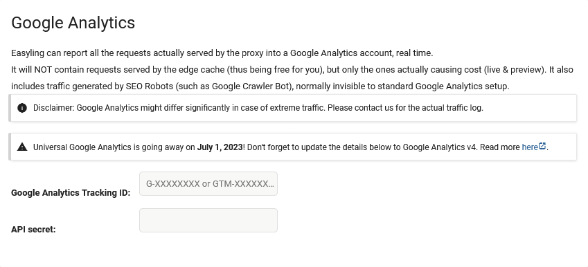 Easyling peut signaler les demandes qui sont facturées selon notre ancien modèle de paiement à l'utilisation à Google Analytics. Comme l'ancienne version, Universal Analytics, est progressivement éliminée, les codes de suivi doivent être mis à jour. Ce mois-ci, nous avons mis à jour nos systèmes pour prendre en charge la nouvelle version. Si vous utilisez cette fonctionnalité, veuillez mettre à jour votre code de suivi dès que possible.