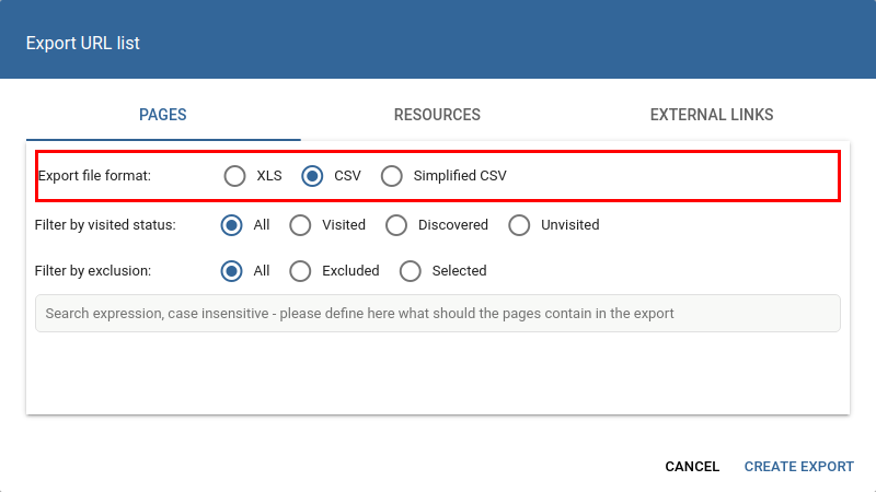 We used to offer two kinds of Page list exports. One was an Excel spreadsheet and the other a simplified CSV version for processing via scripts. Unfortunately, on large projects, Excel exports become unwieldy both to generate and to use. Computers completely freezing up when opening a large spreadsheet in Excel is a serious issue that we addressed this month. The new system offers three options: