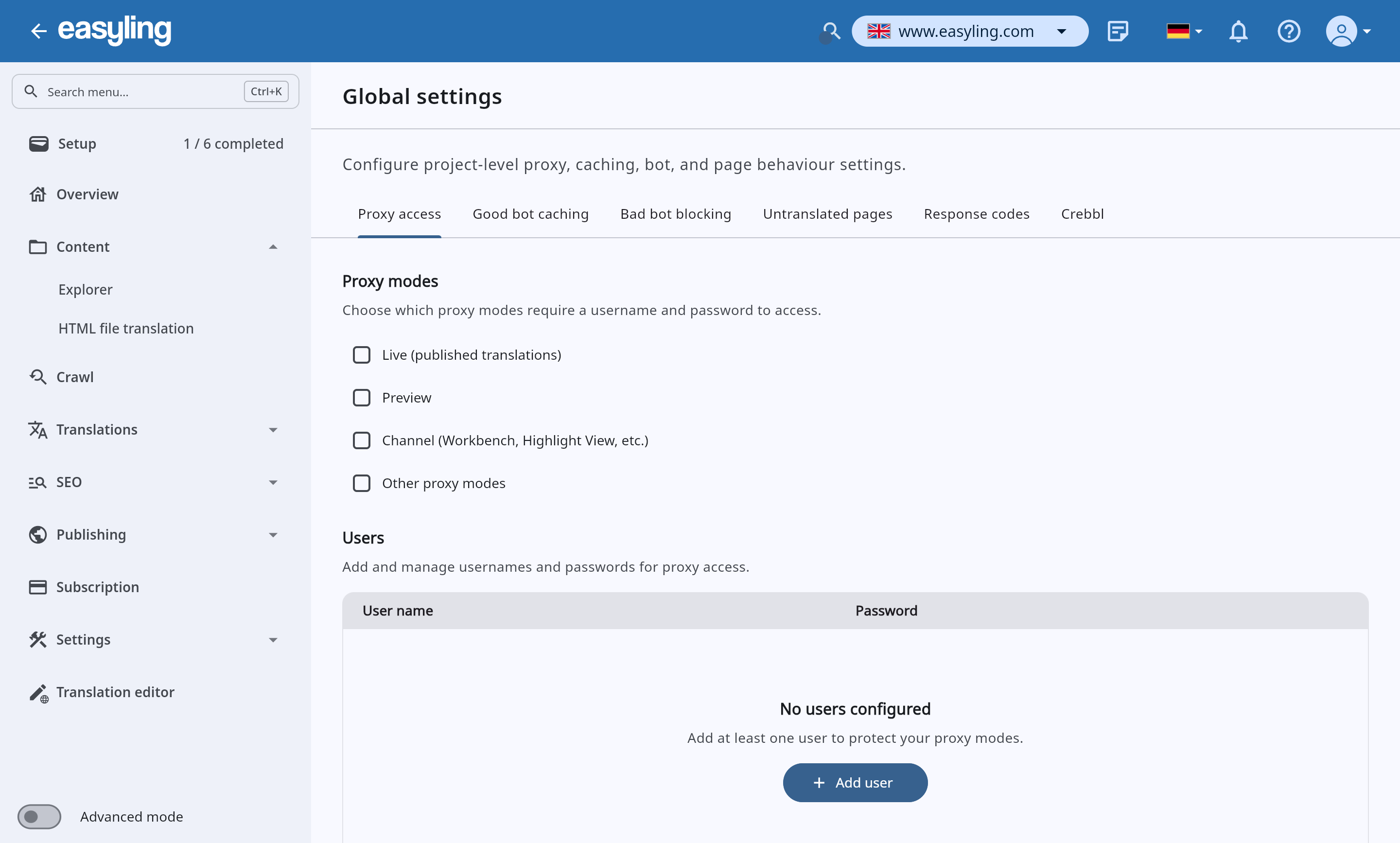 This section contains the most important publishing settings, like access control, caching as well as configuration for Crebbl.