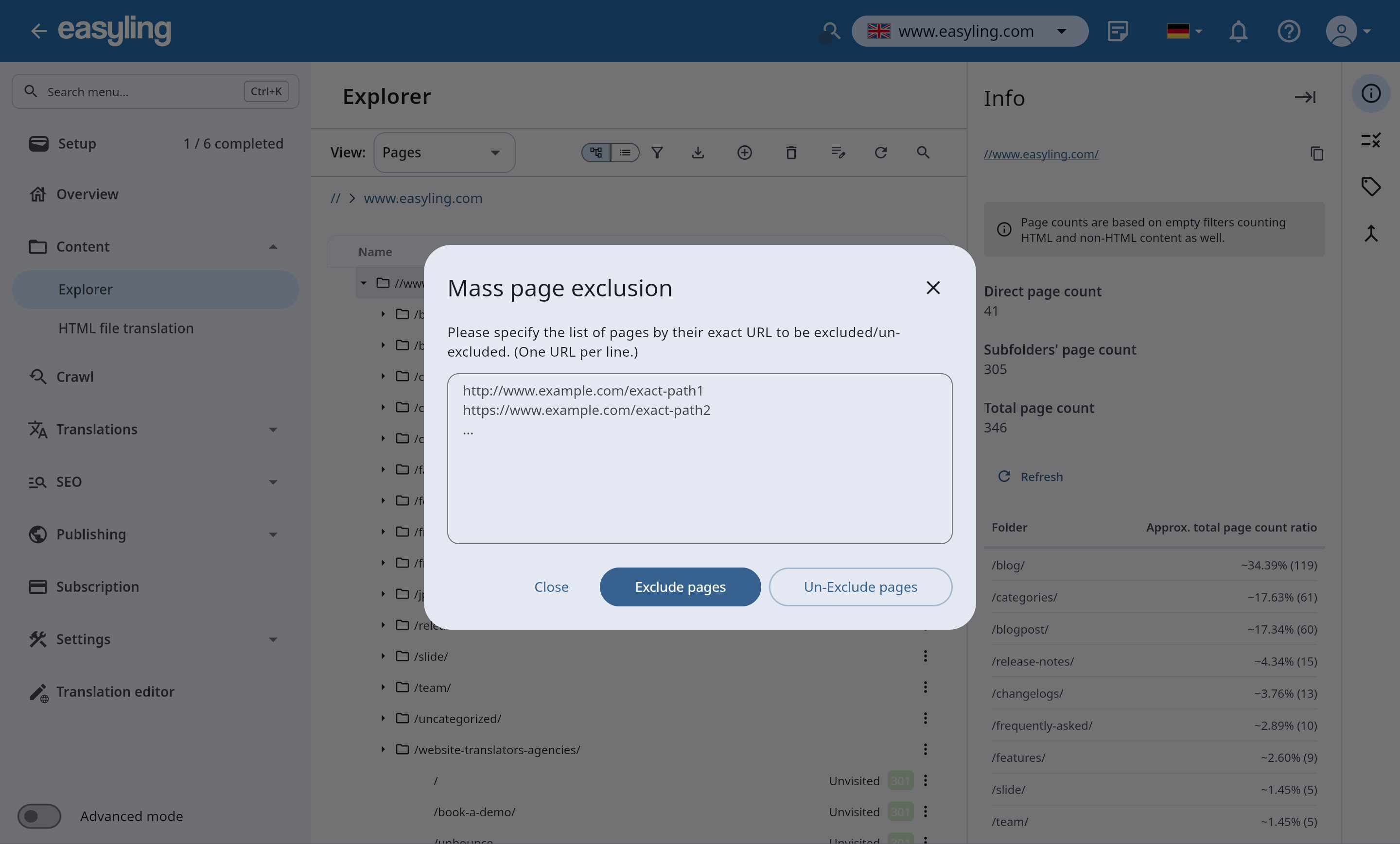 Mass page exclusion allows you to specify a large list of URLs to exclude from the project’s scope. You can access it from the Explorer section. It has a dedicated button near the top next to refresh and search.